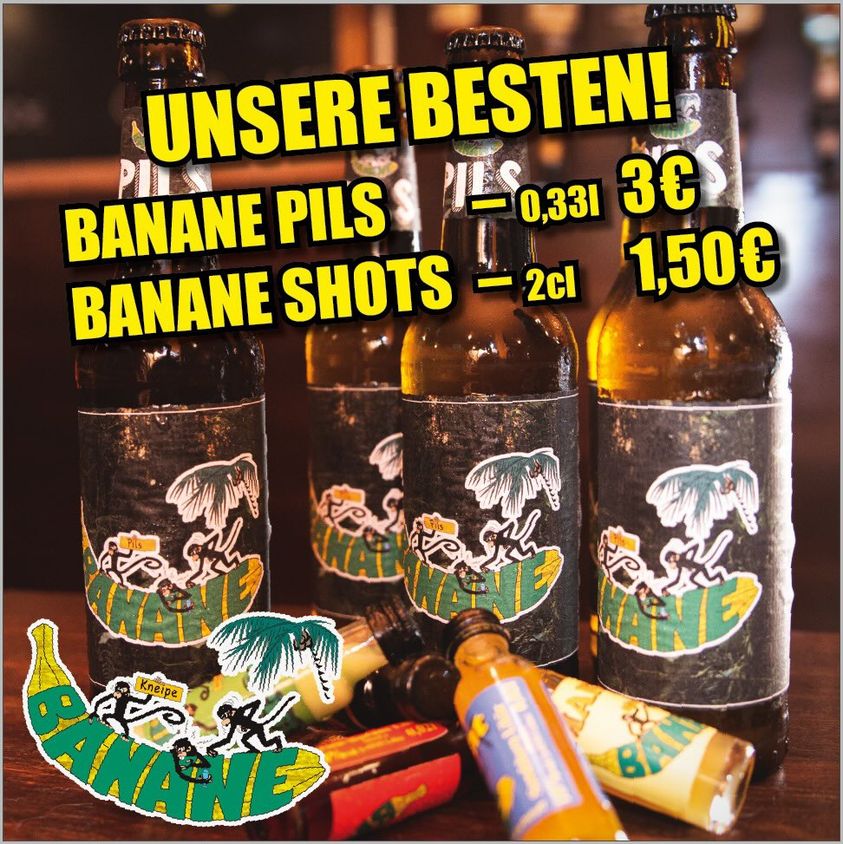 Denn neben dem bekannten Mexikaner, den erst bei der Banane für unschlagbare 1.50€ gibt, sind noch zwei weitere Drinks zu erwähnen. Gemeint ist hier natürlich das Banane Pils und die Banane Shots, beides gibt es übrigens auch im Stoppelmarkt Countdown Kalender im Angebot, also direkt noch fix ein Exemplar sichern.