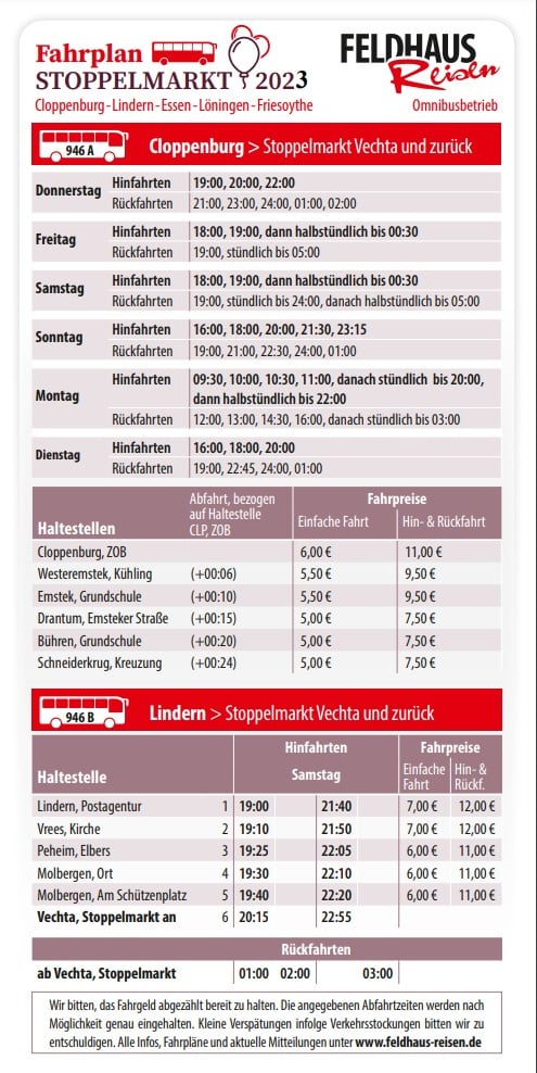 Stoppelmarkt Busfahrplan 2023 für Cloppenburg, Lindern, Essen, Löningen und Friesoythe: