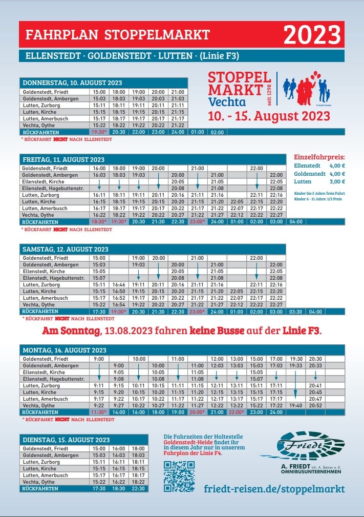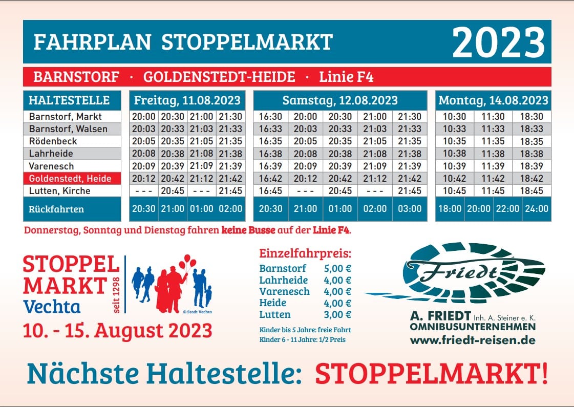 Stoppelmarkt Busfahrplan 2023 für Ellenstedt, Goldenstedt, Lutten, Barnstorf und Goldenstedt-Heide: