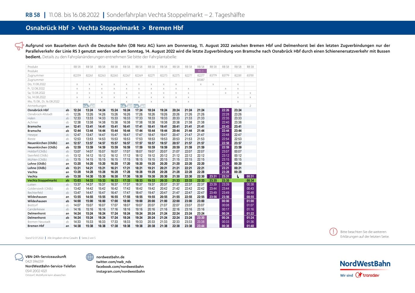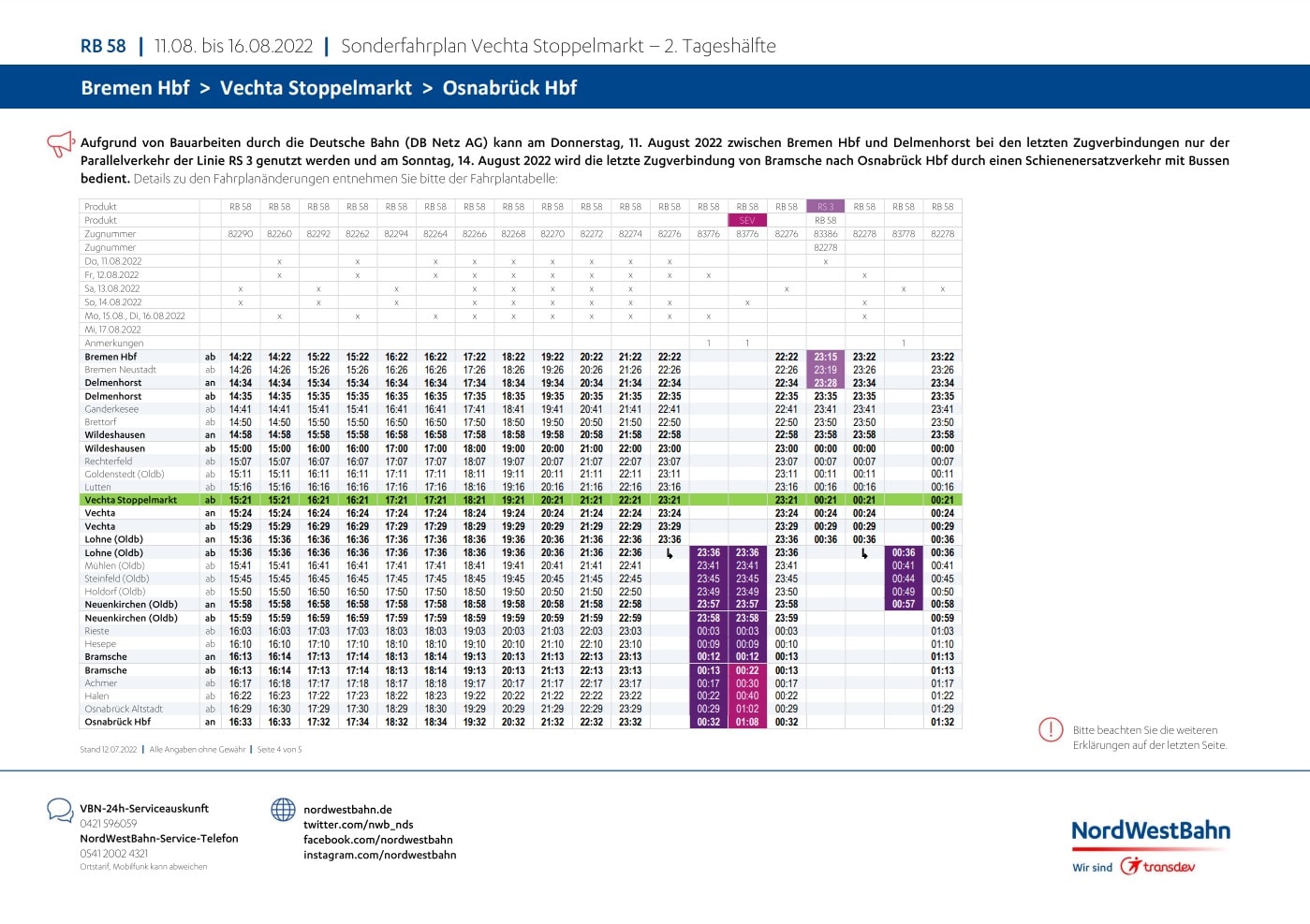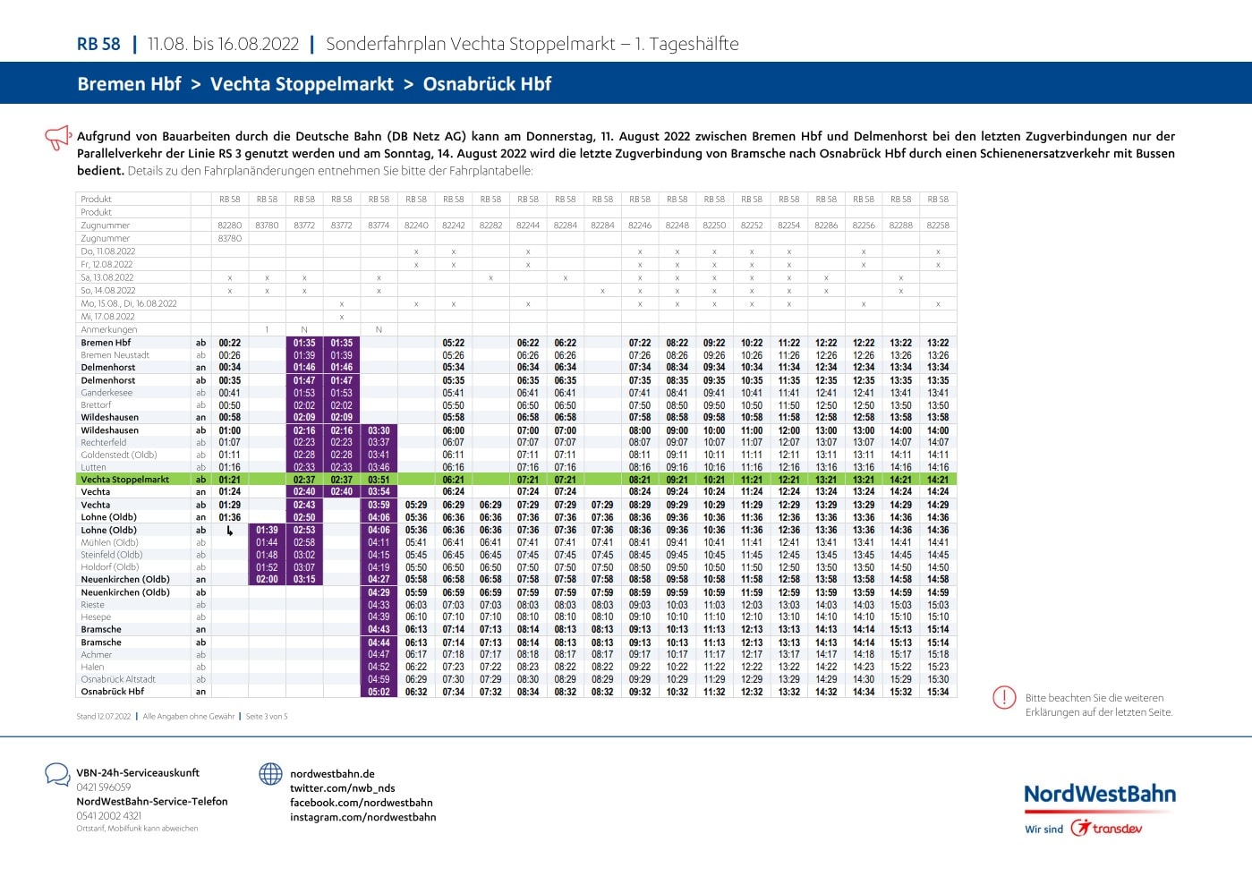 Die Informationen über das 9€-Ticket zum Stoppelmarkt hatten wir euch ja bereits geliefert, nun hat die NordWestBahn den Stoppelmarkt-Zugfahrplan veröffentlicht. Bereits vor einigen Tagen informierte uns die NordWestBahn darüber, dass es zu Einschränkungen im Zugverkehr durch Bauarbeiten kommen wird.