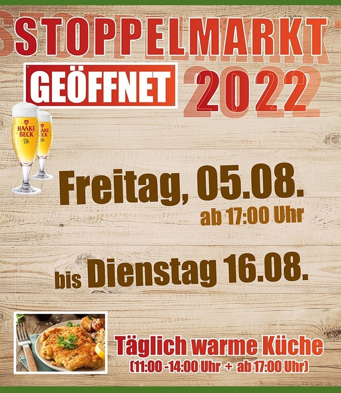 Kommen wir nun also zu den offiziellen Öffnungszeiten von Hof Oldehus, sowie Zelt Stoppel-Schänke, welches gegenüber von Oldehus steht. Übrigens, wie in unserer Übersicht der Stoppelmarkt-Rabatte zu sehen, startet die Stoppel-Schänke mit 50 Liter Freibier, also noch ein Grund mehr, mal vorbei zu schauen.